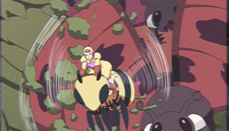 Nessa cena a abelha é vista ao fundo tentando se soltar, nos últimos frames podemos ver ela forçando a retirada da corrente e pelo que indica conseguiu escapar…