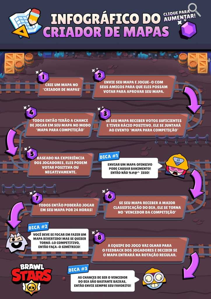 O recurso de criador de mapas foi lançado já faz um tempo no Brawl e com a recente atualização a Supercell trouxe melhorias para o sistema, mas nem todos jogadores entenderam. Então hoje prepararam um infográfico mostrando os detalhes de cada etapa.