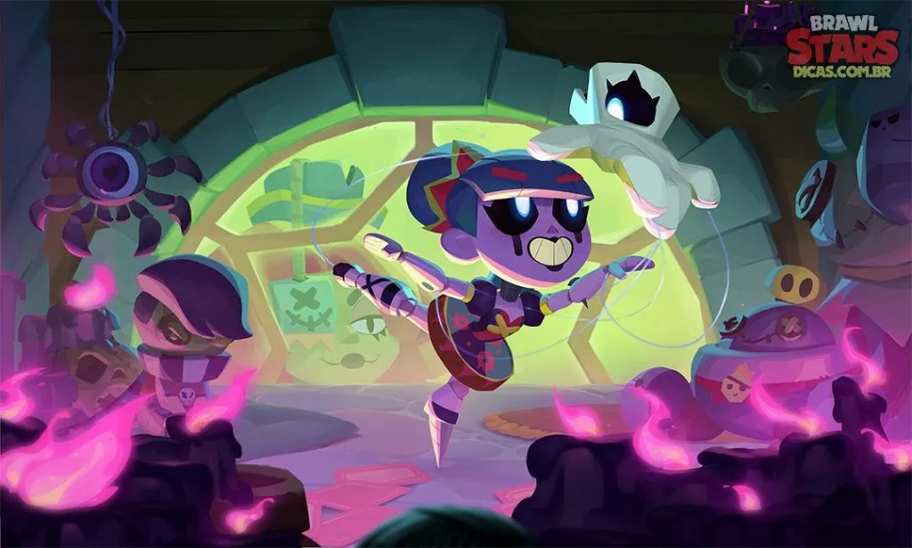 Essa tela de carregamento dá destaque a nova brawler Gigi em toda sua glória sinistra, destacando perfeitamente o ambiente mágico e misterioso que cerca esta brawler única. A arte mostra Gigi como uma bailarina possuída, controlada por uma luva mística que paira acima dela, em meio a um cenário repleto de elementos sobrenaturais típicos do Bazar das Bizarrices, com vudus do Edgar e Tick ao fundo. O visual captura perfeitamente a essência sombria e teatral do Trio da Juju, com tons roxos e verdes que remetem à magia e ao oculto, criando uma atmosfera que combina elegância e terror de forma magistral.