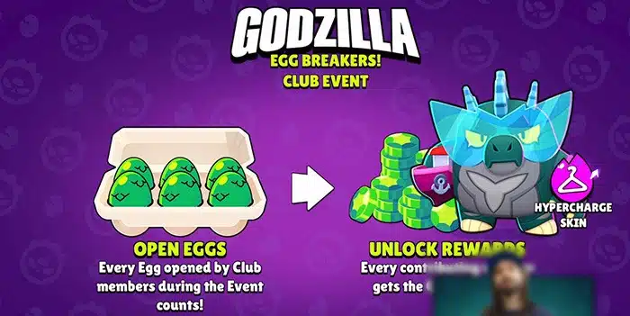 Cada Ovo Monstruoso aberto ajudará a quebrar o Ovo Gigante do Clube, e quando isso acontece, serão distribuídas Gemas e uma recompensa suprema final. Será uma Skin exclusiva de Hipercarga, dessa vez o Buzz Godzilla.