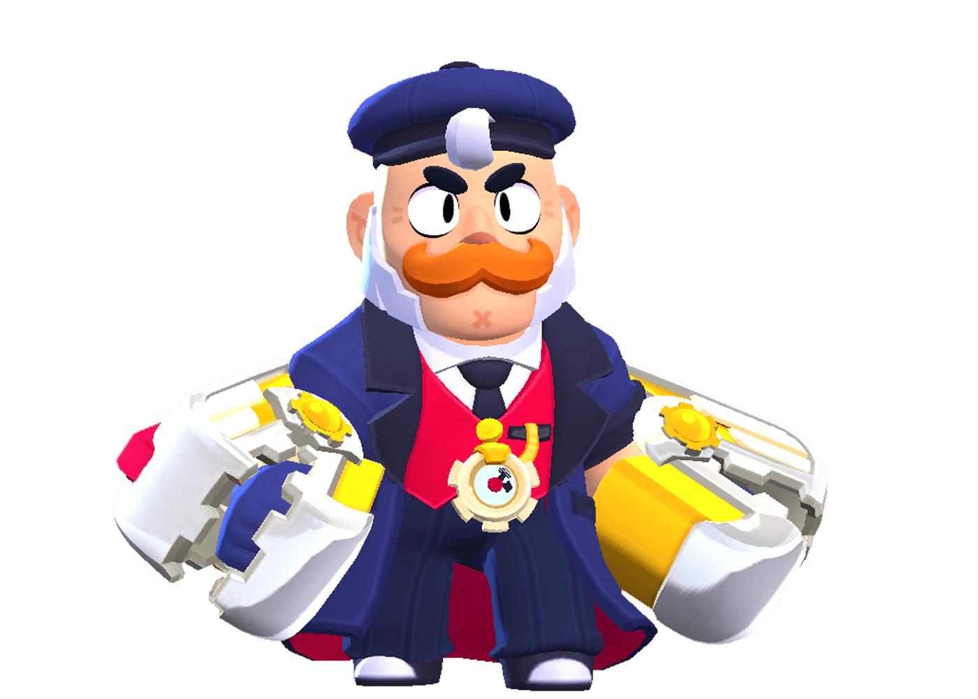 A aparência é de um brawler de idade, cabelo, com barba branca e bigode ruivo, usando roupa de operário e com um detalhe… ele usa manoplas de ferro, com garras e que são carregadas com baterias.