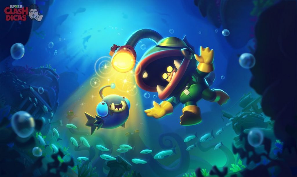 A arte subaquática com Glowbert iluminando as criaturas abissais do fundo do mar representa a chegada do novo curador de janeiro, vindo “das profundezas do Starr Park”. A iluminação forte em contraste com o fundo escuro traduz bem a mecânica de raio contínuo que cura aliados ou derrete inimigos, além de reforçar a temática de pesquisa marinha do personagem.