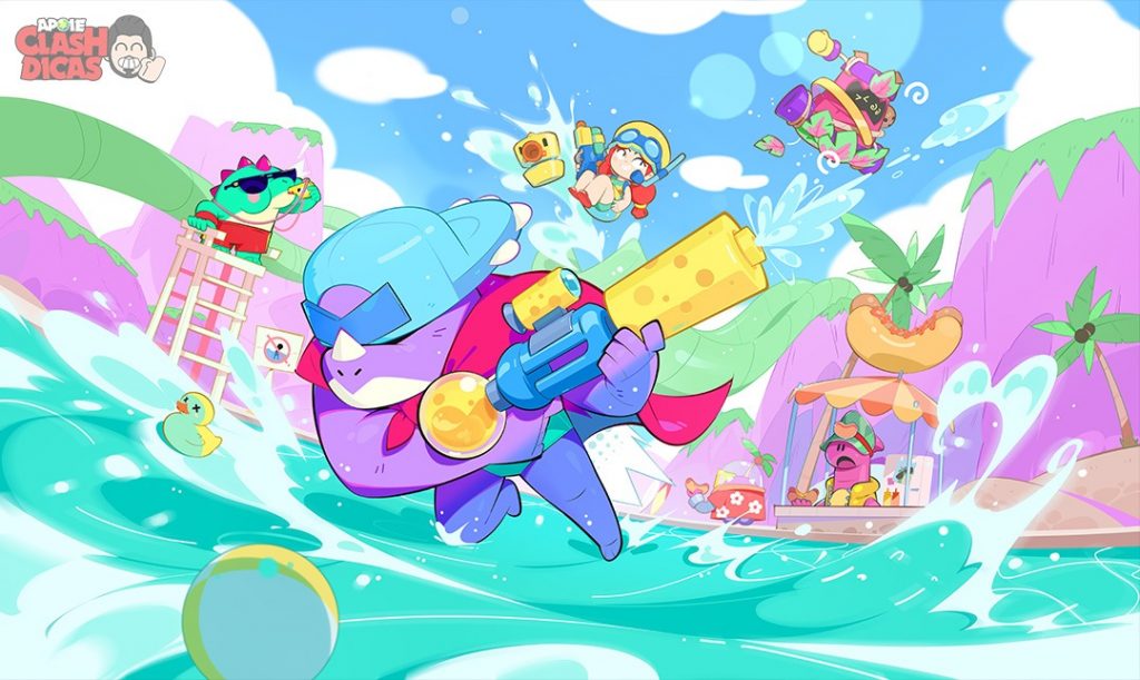 A tela vibrante com Pierce na água, praias ao fundo (mesmo ambiente da tela de 2021) e brinquedos aquáticos celebra o trio Velocirapids e o clima de parque aquático do Starr Park. A água em movimento e o projétil perfurando tudo sintetizam o kit do Brawler: tiros precisos, esferas que atravessam obstáculos e uma jogabilidade focada em pressão constante nas rotas.