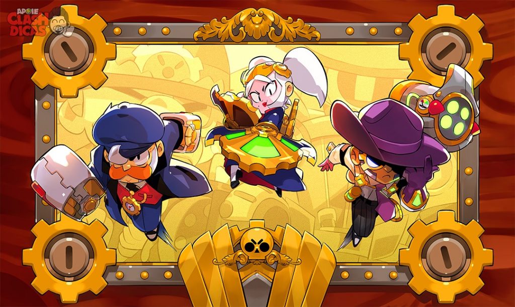 A arte com engrenagens douradas, personagens em roupas de crime estilo steampunk e o grande cofre centraliza visualmente a nova identidade do Brawl Pass 46. O foco no cofre conversa direto com as chaves de Brawler, Skins, Recursos e Buffies, deixando claro que essa temporada é toda sobre escolher o que desbloquear dentro de uma “máquina” de recompensas bem ao estilo Brawl Stars.