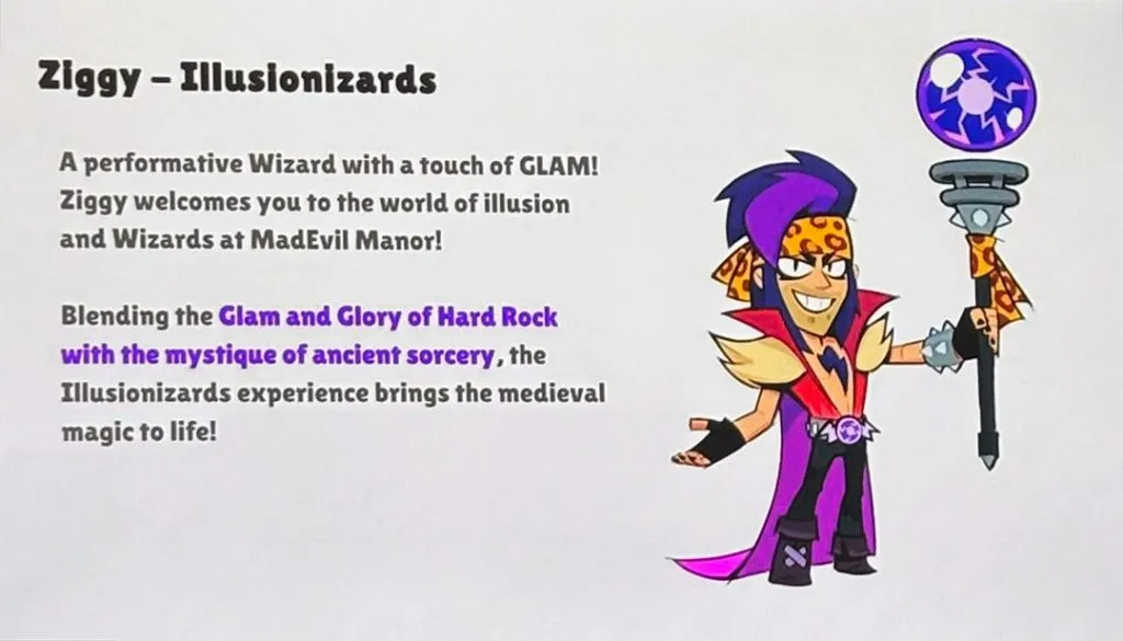 Um Mago performático com um toque de GLAM! Ziggy lhe dá as boas-vindas ao mundo da ilusão e dos Magos na Mansão MadEvil!